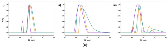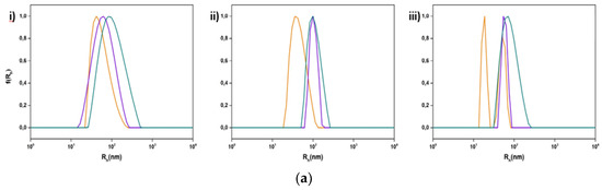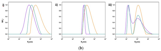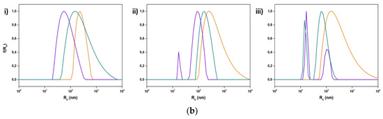 Size distributions from DLS for the hybrid systems incorporating (a) DSPC:P(OEGMA950-DIPAEMA)-1 and (b) DSPC:DOPC:P(OEGMA950-DIPAEMA)-1 in three different lipid to polymer weight ratios, (i) 9:1, (ii) 7:3, and (iii) 5:5, and three different pH media: HCl 0.1 N (pH 1.2) (orange color), water for injection (pH 5.5) (purple color), and PBS (pH 7.4) (green color).