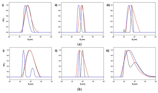 Size distributions from DLS for the hybrid systems incorporating (a) DSPC:P(OEGMA950-co-DIPAEMA)-2 and (b) DSPC:DOPC:P(OEGMA950-co-DIPAEMA)-2 in three different lipid to polymer weight ratios, (i) 9:1, (ii) 7:3, and (iii) 5:5, and three different temperatures: 25 °C (black color), 37 °C (red color), and 60 °C (blue color).