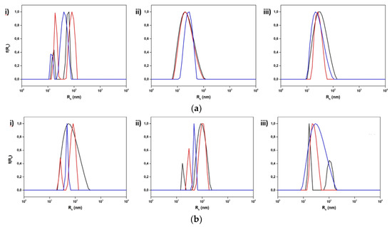 Size distributions from DLS for the hybrid systems incorporating (a) DSPC:P(OEGMA950-co-DIPAEMA)-1 and (b) DSPC:DOPC:P(OEGMA950-co-DIPAEMA)-1 in three different lipid to polymer weight ratios, (i) 9:1, (ii) 7:3, and (iii) 5:5, and three different temperatures: 25 °C (black color), 37 °C (red color), and 60 °C (blue color).