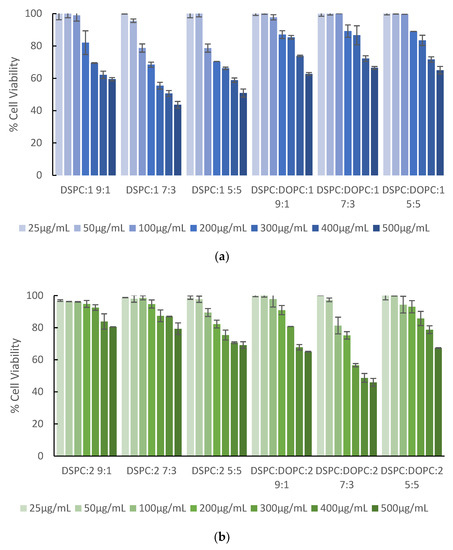 Cell viability vs. different concentrations of DSPC and DSPC:DOPC 9:1 hybrid systems with incorporated copolymer (a) P(OEGMA950-co-DIPAEMA)-1 or (b) P(OEGMA950-co-DIPAEMA)-2 at different lipid to polymer weight ratios. The error bars represent the standard deviation.