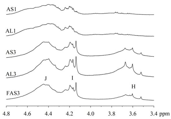 An expansion of the 1H spectra polyol region of the alkyd resins is shown in Figure 2. Through a visual comparison of all the spectra, a clear difference can be seen between alkyds prepared with glycerol (e.g., AS1, AL1) and those prepared with pentaerythritol (e.g., AS3, AL3, FAS3). As specified in Table 2, signal (H) correspond to methylene protons of the CH2OH groups. The degree of branching depends on the esterification degree of the polyol unit [33]. However, PE has a higher degree of OH-functionality than GC. Because of the steric differences, there is a higher probability that more unreacted CH2-OH groups remain in the PE structure in comparison to GC. This assumption is supported by the observation that the intensity of peak (H) is more intense in case of the PE alkyds (AL3, AS3, FAS3) compared to the GC alkyds (AL1, AS1). Peak (I), assigned to the esterified CH2-O- moieties of the PE-containing alkyd resins, has higher signal intensity because of the greater amounts of PE in the batch. On the other hand, peak (J)’s intensity is comparable for all samples, because the same amount of phthalic anhydride was used for the synthesis of all alkyd resins variants.