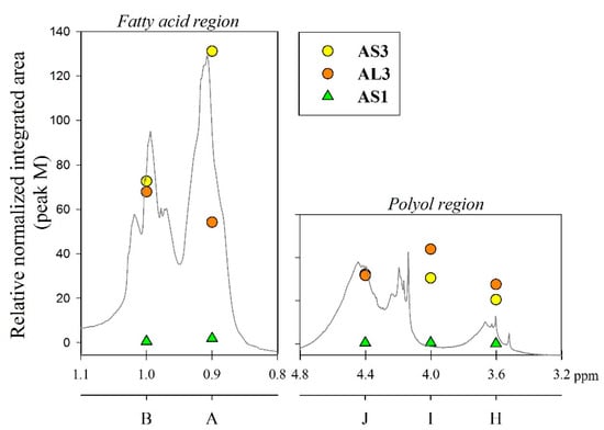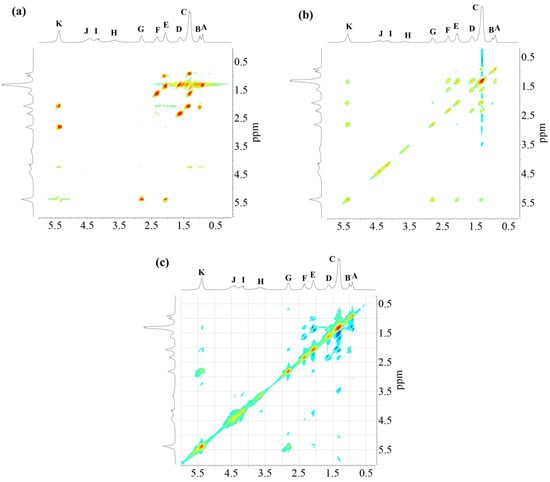 Sample AS3 was analyzed using different 2D NMR experiments in order to investigate the structure in greater detail. The 1H-1H COSY-90 (Figure 5a), 1H-1H TOCSY (Figure 5b), and 1H-1H ROESY (Figure 5c) correlation spectra were recorded. The analysis revealed clearly the coupling of peak (K) with peaks (E) and (G), located in the fatty acid chain (Figure 5a). Moreover, coupling of proton peaks (C), (D) and (F) were confirmed. It was corroborated that protons from terminal methyl groups of linoleic acid chain correspond to peak (A), as it has a strong coupling with protons from peak (C). Thus, peak (B), protons from terminal methyl groups of linolenic acid chain, showed a crosspeak with signal (E) in the COSY and ROESY measurements. It should be noted that methylene protons of peak (E) are also close to those of peak (C). The TOCSY-2D spectra (Figure 5b) additionally confirmed that protons of unsaturated carbons identified as peak (K), correlates with protons from internal methylene groups of the aliphatic chains (peak (C)).