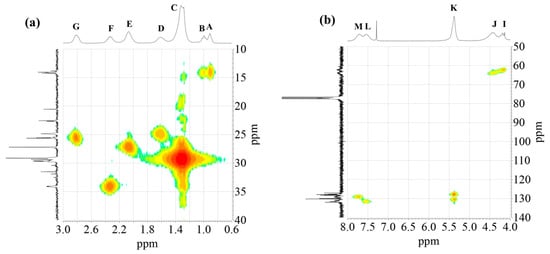 The 2D 1H-13C HMQC spectra (Figure 6) were also acquired for AS3 sample. Figure 6a shows the expanded spectra containing identified 1H NMR peaks (A) to (G) (Figure 1), located in the δ 0.6 to 3.0 ppm region, and carbons C7 to C12 that appeared from δ 10 to 40 ppm in the 13C NMR spectra (Figure 4). Proton peaks (A) and (B) showed the expected connectivity with carbon peaks around δ 13.8–14.3 ppm, C12 identified in Figure 4, which represent terminal methyl groups on fatty acid chains.