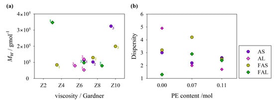 The molecular weight distribution was correlated with the viscosity of resins, as previously reported by our research group [16,17]. As seen in Figure 7a, oil-based resins that had Gardner viscosities in the range between Z5 and Z8 presented a lower than 1.4 × 105 g/mol. High molecular weights have been related to high degrees of cross-linking [41]. On the other hand, fatty acid-based resins, despite having a greater viscosity range from Z3 to Z10, presented higher and homogeneous degrees of cross-linking. It is important to remark that fatty acid-based resins had a near or even higher than 105 g/mol.