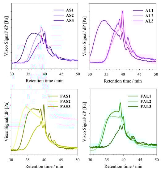 Linseed fatty acid-based alkyds had dispersity below 3, while SIFA-based resins have Đ values over 2.5. FAL1 sample had the lowest dispersity. On the other hand, samples with a higher content of PE (e.g., FAS3, FAL3) had similar Đ, despite being synthesized with different fatty acid sources. Đ trend is different from that observed in the case of oil-based alkyd resins, possibly because of the differences in reaction times or minimal differences in the preparation of the fatty acids during the synthesis process. However, the alkyds prepared with the highest PE content had the lowest variation in the dispersity values.