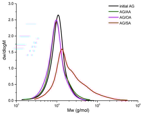 The MWDs (Figure 3) of the arabinogalactan samples modified with all the investigated carboxylic acids shift toward lower molecular weights, which demonstrates the predominance of hydrolysis of side chains and the esterification reactions with only one carboxylic acid group (Section 3.2).