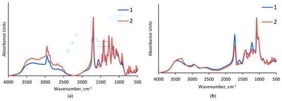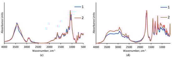 According to the data presented in Figure 4, the samples of the arabinogalactan derivatives with polybasic carboxylic acids obtained by different methods yield similar absorption bands and their spectra only differ in intensity. In the middle portions (1750–1690 cm−1) of the spectra, the absorption bands of esters of carboxylic acids appear. The maximum absorption intensities of the modified arabinogalactans correspond to the bands at 1699, 1701, and 1724 cm−1, which are related to the C=O stretching vibrations []. However, the absorption bands of esters in arabinogalactan films cross-linked by oxalic acid appear with the lowest intensity (Figure 4c).This phenomenon is associated with the relatively high dissociation constants of oxalic acid, as a result of which, together with esterification, the hydrolysis of arabinogalactan side chains occurs (Figure 2 and Figure 3).
