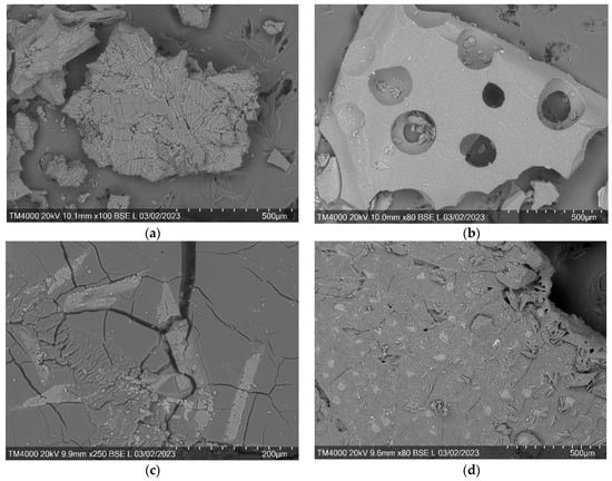 SEM scans of arabinogalactan and its derivatives (thermal drying): (a) AG/AA, (b) AG/CA, (c) AG/OA, and (d) AG/SA.