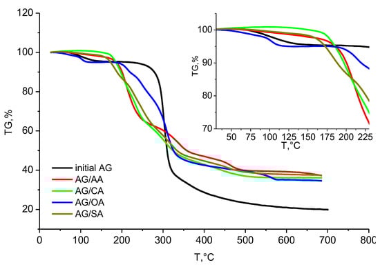 The modification of arabinogalactan with carboxylic acids changes significantly the nature of its thermal decomposition (Figure 8). After thermal drying, the temperature of the onset of the main decomposition in the modified samples decreased by 70–80 °C (Table 3), except for sample AG/OAthermal, which remained heat resistant up to 190 °C. The range of the stage of the main decomposition of the investigated samples noticeably broadened, which is indicative of a significant modification of the arabinogalactan structure by carboxylic acids. Samples AG/AAthermal, AG/CAthermal, and AG/SAthermal completed their thermal decomposition by 500 °C, while the weight losses in the samples at this thermal degradation stage were 57.64%, 62.64%, and 59.22%, respectively. The interval of the main thermal destruction of sample AG/OAthermal was much wider: from 190 to 571 °C (the weight loss was 59.28%). In addition, by the end of pyrolysis, sample AG/OAthermal had a smaller residue, which may suggest a deeper transformation of its structure with the formation of the least thermally stable fragments.