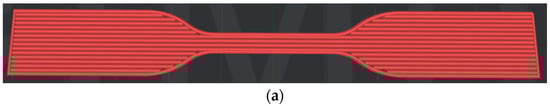 A commercial ABS filament, as well as a filament with ABS matrix and SCF filler from REC (Russia) with a diameter of 1.75 mm, was used for the experiments. A Raise3D Pro2 Plus 3D printer was used for sample manufacturing. Standard samples for tensile and three-point bending tests, as well as monofilament samples for tensile tests, were produced with nozzle diameters of 0.4 mm and 0.8 mm. The tensile samples (Figure 1a) were made according to ISO 527-2:2012, with two infill angles: 0 and 90 degrees. The three-point flexural testing method was used to investigate the interlayer adhesion. The samples for bending tests were rods (length 100 mm, width 20 mm, height 10 mm) with an inner hole (length 100 mm, width 15.2 mm, height 5.2 mm). The size of the hole was chosen so that the wall thickness was divided by integer parts of the line widths when printing with different nozzles (Figure 1b). Single-layer monofilament samples were produced in such a way that the thickness of the working area of the sample corresponded to the thickness of the nozzle (Figure 1c).