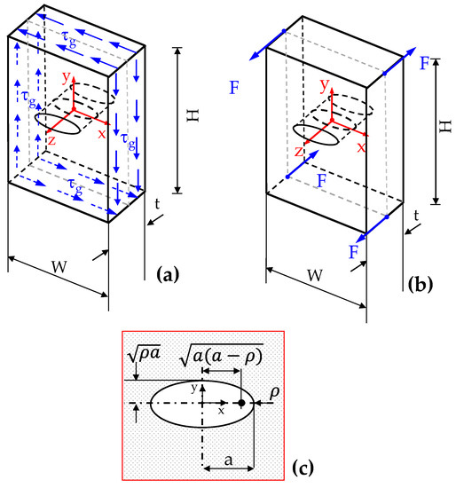 Elliptic hole in a three-dimensional plate under in-plane shear (a) or twisting (b). In (c) a schematic of elliptic hole is reported together with the dimensions used in the mathematical treatise and in the results’ discussion.