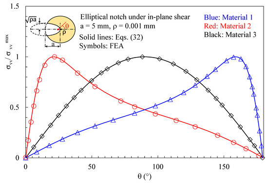 Disc with t = 1 mm and weakened by an elliptical notch with = 0.001 mm. Mode 2 loadings, different materials. In-plane stress component σvv along the notched edge together with a comparison with Equation (32). Distance from the midplane z/t = 0.4.
