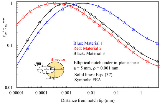Disc with t = 1 mm and weakened by an elliptical notch with = 0.001 mm. Mode 2 loadings, different materials. In-plane stress component τxy along the notch bisector together with a comparison with Equation (37). Distance from the midplane z/t = 0.4.