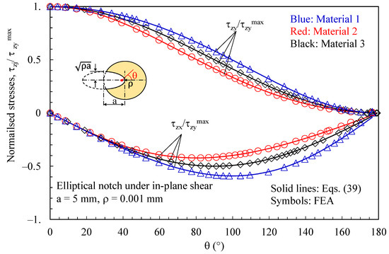 Disc with t = 1 mm and weakened by an elliptical notch with = 0.001 mm. Mode 2 loadings, different materials. Induced out-of-plane stress component τzy along the notch bisector together with a comparison with Equation (42). Distance from the midplane z/t = 0.4.
