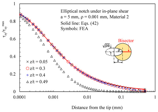 Disc with t = 1 mm and weakened by an elliptical notch with = 0.001 mm. Mode 2 loadings, material 2. Induced out-of-plane stress component τzy along the notch bisector together with a comparison with Equation (42). Different distances from the midplane (z/t).