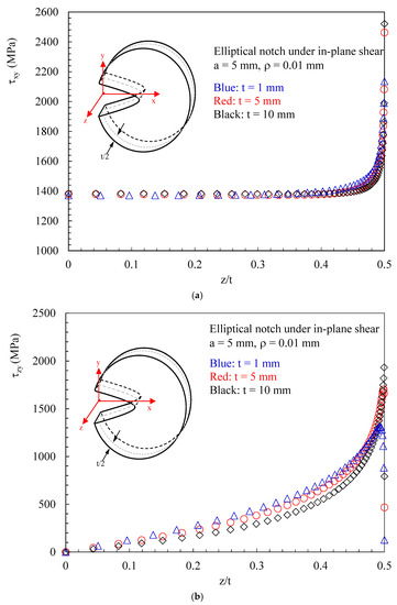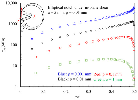 Figure 10 and Figure 11 present the effects of different notch root radii in terms of out-of-plane shear stresses. In particular, it can be noted from Figure 10 that, when increasing the notch radius: