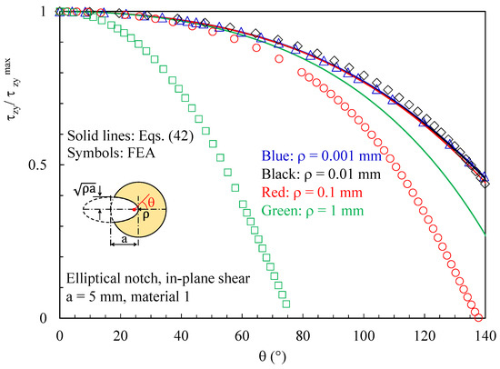 Discs with t = 1 mm and weakened by elliptical notches. Mode 2 loadings, material 2. Induced out-of-plane stress component τzy along the notch bisector together with a comparison with Equation (42). Different values for the notch root radius.
