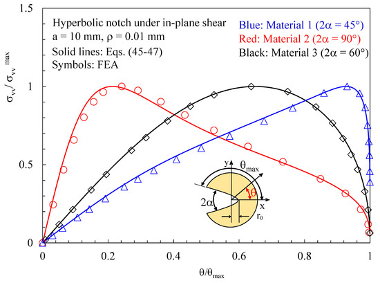 Discs with t = 1 mm and weakened by hyperbolic notches with = 0.01 mm. Mode 2 loadings, different materials. In-plane stress component σvv along the notch edge together with a comparison with Equations (45)–(47). Distance from the midplane z/t = 0.4.