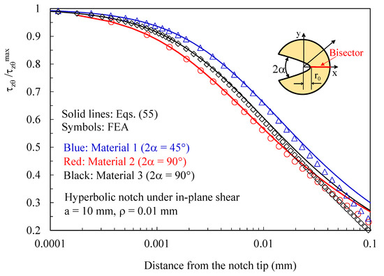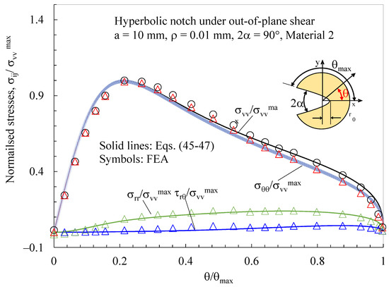 Finally, the disc made with material 2 and weakened by a hyperbolic notch with = 0.01 mm and 2α = 90° was loaded under pure mode III (applying the displacement fields reported in Appendix A). For this case, Figure 15 documents the existence of induced in-plane shear stresses (induced mode 2), which can be accurately predicted using Equations (45)–(47).