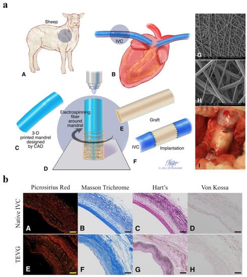 Preclinical study of cell-free 3D-printed nanofiber vascular grafts. (a) Study design of cell-free patient-specific nanofiber tissue-engineered vascular graft. (A,B) Acquiring the topographical information of the blood vessel from a preoperative angiogram in a sheep model. (C) Three-dimensional-printed mandrel designed with computer-aided design (CAD). (D) Electrospinning fibers around mandrel to fabricate nanofiber vascular grafts. (E) Nanofiber vascular graft. (F) Implantation of fabricated grafts. (G,H) SEM images of nanofibers. (I) Image of the implanted vascular graft. (b) Collagen and elastin deposition at 6 months postimplantation. Picrosirius red (A), Masson’s trichrome (B), Hart’s (C), and von Kossa (D) stainings of native inferior vena cava (native IVC) at 6 months. Picrosirius red (E), Masson’s trichrome (F), Hart’s (G), and von Kossa (H) stainings of tissue-engineered vascular graft (TEVG) at 6 months. Ref. [96] Copyright 2017, Elsevier.