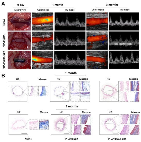 In vivo implantation of PEGDA-based vascular grafts. (A) Microscopic views after implantation and ultrasound images of native blood vessels (native), PHA/PEGDA grafts (PHA/PEGDA), and PHA/PEGDA grafts with uniformly dispersed graphdiyne (PHA/PEGDA-GDY). (B) HE and Masson staining results of implanted grafts. Ref. [123] Copyright 2022.