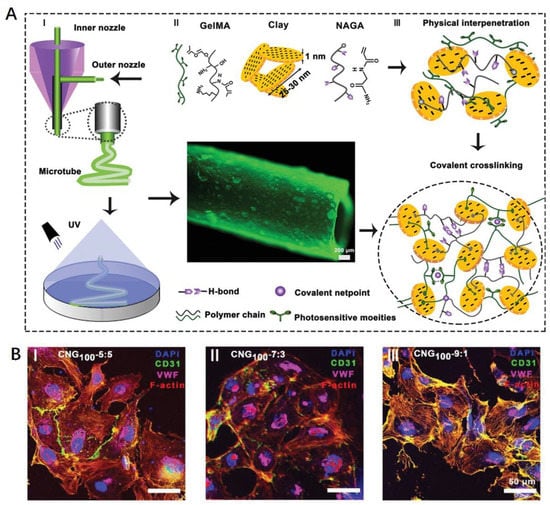 Collagen and its derivative gelatin are the most used natural polymers in vascular tissue engineering. Collagen is the main component of the ECM in most tissues, including blood vessels [129]. However, the in vivo degradation rate of collagen is approximately 5 h, which is too short for clinical applications [130]. Crosslinked collagen conduits after dehydration can match a mammalian vein value with a burst pressure of ~1300 mmHg and a compliance of 1.7%/100 mmHg, but a low strength at anastomosis interfaces [131]. Circular electronspun meshes of collagen were developed by Zhang et al., possessing a similar dynamic compliance and increased rupture force to saphenous veins [132]. Collagen and gelatin were also used in combination with synthetic polymers for vascular scaffold fabrication through electrospinning [42,133]. By altering the concentration of natural proteins, the hemocompatibility and mechanical strength can be balanced for vascular cell growth and a reduction in the local inflammatory response [109]. In order to increase the mechanical strength of the grafts, gelatin was modified with methacrylate groups to form a semisynthetic gelatin methacryloyl (GelMA), which could maintain the bioactivity of gelatin with adjustable mechanical properties [134,135]. The cell-attached peptide motifs of GelMA hydrogels mimic the essential properties of native ECMs for cell proliferation and spread, while the metalloproteinase-responsive peptide motifs lead to dilation and a decrease in mechanical strength after in vivo implantation [136]. Liang et al. developed a series of diameter-tunable microtubes with enhanced mechanical strength by blending a H-bonding monomer N-acryloyl glycinamide nanoclay with GelMA (Figure 5) [137]. The coaxial printed vascular grafts exhibited a Young’s modulus of ~21 MPa, a burst pressure of ~2500 mmHg, a suture retention strength of ~280 gf, and an antifatigue performance of ~200 cycles [137].