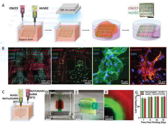 Cell-laden elastic constructs using modified human-recombinant elastin. (A) A schematic illustration of cell-laden 3D printing. (B) Immunostaining of the printed structure at 7 days after printing. (C) Scheme of vascularized tissue printing. (D–F) Optical and fluorescence images of printed vascularized tissue. (G) Cell viability after printing. Ref. [142] Copyright 2020, Wiley-VCH.