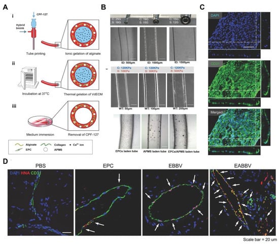 Alginate is an anionic polysaccharide composed of guluronic acid and mannuronic acid [160]. Alginate can go through ionotropic gelation in the presence of divalent ions such as Ca2+. However, there are no cell-adhesive ligands on it before chemical modification. Cell-adhesive motifs, such as RGD peptides, gelatin, heparin, etc., were used to modify alginate to optimize the microenvironment for cell development [161]. Gao et al. incorporated decellularized ECMs into an alginate hydrogel and developed a series of vascular tubes through the coaxial printing technique [162,163,164]. It was reported that the engineered EC-laden grafts exhibited not only an endothelium maturation, but also selective permeability and antithrombogenicity [164]. Moreover, when combined with an atorvastatin delivery microvehicle, endothelial progenitor cells (EPCs) could quickly eliminate local ischemia in a mouse model (Figure 7) [163].