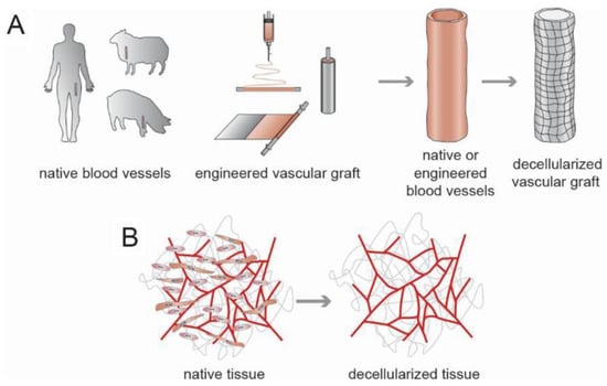Strategies for fabrication of decellularized vascular grafts [64]. (A) Scheme for decellularized vascular grafts in large scale. (B) Scheme for decellularized vasculature grafts. Copyright 2019, Wiley-VCH.