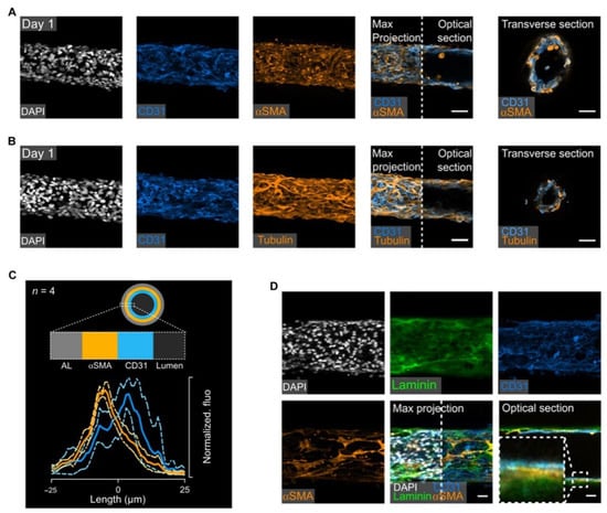 Self-organization of ECs and SMCs into artificial mature blood vessels. (A,B) Confocal imaging of engineered vessels immunostainings. (C) Fluorescence intensity distribution of αSMA and CD31. (D) Immunostaining images of laminin, CD31, αSMA, and DAPI of self-assembled vascular grafts. Ref. [195] Copyright 2019.