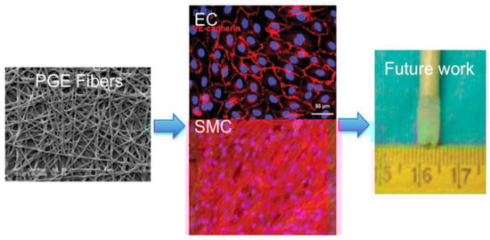 SEM images of hybrid PLGA–gelatin–elastin fibers (PGE fibers), immunofluorescence images of EC and SMC cultured on PGE fibers, and image of PGE fiber vascular grafts. Ref. [208] Copyright 2011, American Chemical Society.