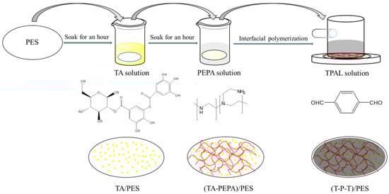 A schematic diagram of the synthesis process of the composite nanofiltration membrane is shown in Figure 2. First, 30 mg of TA was dissolved in 100 mL of Tris-HCl buffer solution (adjusted to pH 7.8 with HCl), and then the PES ultrafiltration membrane was soaked in TA solution for 1 h and removed, which was recorded as TA/PES. The membranes were washed 3–5 times with deionized water to remove the excess TA from the membrane surface. Subsequently, the TA/PES membranes were immersed in an aqueous PEPA solution at a concentration of 0.3 g·L−1 for 0.5–12 h, noted as (TA-PEPA)/PES. The membranes were washed 3–5 times with deionized water to remove the excess PEPA from the membrane surface. Subsequently, 10 mg–50 mg of TPAL was dissolved in 50 mL of hexane, and the (TA-PEPA)/PES membrane was immersed in the hexane solution for 10–40 min, noted as (T-P-T)/PES. It is worth noting that only the upper surface of the membrane was immersed in the TPAL solution. After the reaction was completed, the membrane surface was rinsed with hexane 3–5 times to remove the excess TPAL. Finally, the membrane was cured at 40 °C for 2.5 or 10 min.