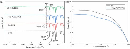 Fourier transform infrared (FTIR) spectroscopy was used to characterize the surface chemical structure of the pristine and modified membranes []. As shown in Figure 3a, the PES membrane shows typical absorption peaks at 1578 cm−1 and 1487 cm−1, which are related to the stretching vibration of the benzene ring. The peak at 1297 cm−1 is the bending vibration peak of S=O in the PES membrane. After the deposition of TA, the modified membrane showed a new characteristic peak at 1726 cm−1, which was related to the stretching vibration of C=O, indicating that TA was successfully oxidized to the quinone group and encapsulated on the membrane surface. In addition, the absorption peak at 1664 cm−1 may be the overlap of the C=C resonance vibration and C=N stretching vibration in the aromatic ring. Figure 3b shows that the vibrational peak of the N-H band at 1506 cm−1 is present in the (TA-PEPA)/PES membrane due to the Michael addition reaction and Schiff base reaction of the TA with the single bond -NH2 of the PEPA []. In the (T-P-T)/PES membrane, a new characteristic absorption peak at 1698 cm−1 was observed, which was attributed to the stretching vibration of the aldehyde group.