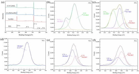 XPS was used to characterize the content and proportion of the chemical elements on the membrane surface. The elemental composition and X-ray photoelectron spectrum of PES membranes and modified membranes are shown in Table 2 and Figure 4. After the original PES membrane is modified by TA, the content of the O element increases sharply, from the original 17.31% to 23.6%. Due to the large number of phenolic hydroxyl groups in the TA, the increase in the O element is reasonable. From Figure 4b, it can be seen that two absorption peaks of O appear in the PES membrane at 533.58 eV and 531.68 eV, which can be attributed to the C-O and S=O on the PES membrane. In Figure 4c, a new peak appears at 531.78 eV, which is attributed to C=O, while the presence of C=O indicates the self-assembly of TA on the membrane surface after oxidation. Meanwhile, the increase in the proportion of C-O peaks is attributed to the abundance of C-O groups in the TA. With the deposition of PEPA, the content of the O element decreases and the content of the N element on the membrane surface increases due to the high amount of -NH2 in the PEPA. These results indicate that TA-PEPA is co-deposited on the PES membrane surface. In contrast, in the (T-P-T)/PES membrane, the content of the O element is elevated, which is due to the high content of the aldehyde groups in TPAL. In addition, the N/O ratio decreases after the TA-PEPA layer is cross-linked by TPAL. Similarly, the PES membrane showed a single peak of N1s at 399.44 eV, which was related to C-N (Figure 4d). In addition, in the (TA/PEPA)/PES membrane (Figure 4e) and (T-T-P)/PES membrane (Figure 4f), the N1s could be divided into two peaks attributed to C-N and C=N, respectively. In addition, the proportion of C=N peaks increased in the (T-T-P)/PES membrane. This was consistent with the ATR-FTIR results, which further verified the reaction among TA, PEPA, and TPAL.