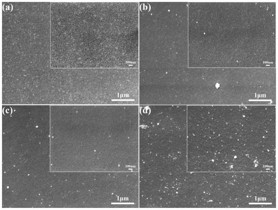 The surface morphologies of the original PES membranes and the modified membranes are shown in Figure 6. From Figure 6a, it can be seen that the surface of the original PES membranes was relatively smooth with a large number of uniformly sized circular pores. With the self-aggregation of TA and its attachment to the membrane surface, the number of pores on the membrane surface became significantly less, and the diameter of the pores becomes smaller, which was attributed to the formation of a selective layer of TA on the membrane surface (Figure 6b). When PEPA was added, it reacted with the TA to form a dense coating and covered the membrane surface, and the pores on the membrane surface were almost invisible (Figure 6c). Figure 6d shows the electron microscope image of PEPA and TPAL after interfacial polymerization, and it can be seen that the membrane surface shows a rough texture and a large number of white dotted spheres, which cover the membrane surface relatively uniformly and form a dense selective shape layer, and the pores on the membrane surface almost completely disappear. This result also indicates the successful preparation of the modified membrane, which provided the basis for the subsequent dye separation.