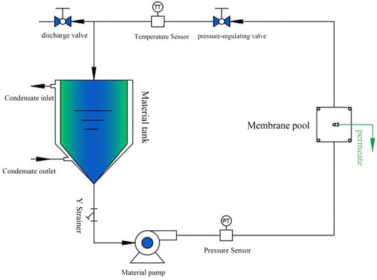 The flat plate membrane performance test setup is shown in Figure 8. Filtration experiments were conducted on a staggered cross-flow filtration system with an effective membrane area of 15.9 cm2. All the filtration experiments were performed at a pressure of 2.5 bar. The membranes were pre-pressurized in pure water for 30 min to achieve stable permeation of pure water before performing the filtration experiments. The membrane permeability was calculated by measuring the volume of the filtered solution, and the dye removal rate of the membrane was calculated by measuring the absorbance of the solution before and after filtration.