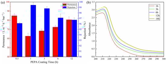 Since the coating parameters have a great influence on the surface properties of membranes, the effect of the coating parameters on the membrane separation performance was investigated in detail by a cross-flow filtration system in this study. The effect of the PEPA deposition time on the separation performance of the (T-P-T)/PES membranes is shown in Figure 9a. When the fixed TPAL concentration was 0.6 g·L−1, the interfacial reaction time was 30 min, and the curing time was 5 min. It was found that with an increase in the PEPA deposition time, the permeance of the (T-P-T)/PES membrane first decreased and then increased, while the rejection of methyl blue was the opposite. The removal rate of methyl blue reached the maximum when the PEPA deposition time was 1 h. Generally speaking, with an increase in time, the thicker the selective layer formed by the modified substance on the membrane surface, the greater the membrane permeability resistance, the smaller the permeance, and the higher the rejection. However, the experimental results show that to be the opposite. This is because covalent bonds are formed by the addition reaction between TA and PEPA, while TA is deposited on the PES membrane in the form of hydrogen bonding and π-π conjugation. The force between the covalent bonds is much greater than that of hydrogen bonding and π-π conjugation. As a result, part of the TA on the PES film is shed and dissolved in the PEPA solution. Therefore, we analyzed the TA/PES membrane immersed in PEPA solution at different times by a UV-Vis spectrophotometer, and the results exactly illustrated this point. As can be seen in Figure 9b, there is a significant red shift in the UV spectrum with increasing immersion time, which is due to the increase in chromophores (C=O, C=N) in the solution []. After weighing up the advantages and disadvantages of the retention and water flux, a deposition time of 1 h was chosen as the parameter for subsequent experiments.