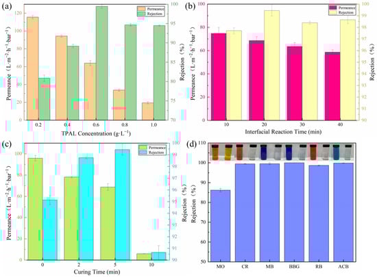 (a) Effect of TPAL concentration (PEPA deposition time was 1 h, interface reaction time was 30 min, curing time was 5 min); (b) Effect of interfacial reaction time (fixed TPAL concentration was 0.6 g·L−1, PEPA deposition time was 1 h, curing time was 5 min); (c) Effect of curing time (fixed TPAL concentration was 0.6 g·L−1, PEPA deposition time was 1 h, and the interfacial reaction time was 20 min); (d) The effect of (T-P-T)/PES membranes on various dye retention rates.