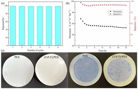 To further evaluate the practicality of the (T-P-T)/PES composite membranes, the reusability of the membranes was characterized by filtering the methyl blue solution. As shown in Figure 11a, with an increase in the number of cycles, the rejection of the modified membranes was almost stable and remained above 98%. This indicates that the (T-P-T)/PES composite membranes can remove surface contaminants by simple washing, and the membrane pores of the modified membranes have a certain stability.