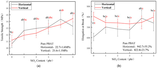 Effect of SiO2 dosage on mechanical properties of PBAT/TPHSg-SiO2 (8/2) composite films. (a) Tensile strength; (b) Elongation at break.
