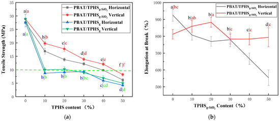 Effect of TPHS content on mechanical properties of PBAT/TPHSg-4SiO2 composite films. (a) Tensile strength; (b) Elongation at break.