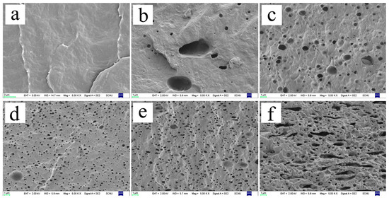 Figure 4 shows the cross-sectional morphology of the composite films. The contents of thermoplastic hydroxypropyl starch in Figure 4a–f are 0%, 10%, 20%, 30%, 40%, and 50%, respectively. The film sections were freeze-fragmentations in liquid nitrogen and dipped in distilled water for one day to remove the starch phase from the film completely. Figure 4a shows the cross-sectional morphology of pure PBAT with smooth cross-section. As the content of TPHSg-4SiO2 gradually increased, the number of holes increased significantly, and the holes show spherical or sphere-like shapes. When the content of TPHSg-4SiO2 was 40% and above, the TPHSg-4SiO2 balls were deformed and connected, and the phase structure of the composites changed from island structures to two-phase continuous structures. This also leads to a dramatic decrease in mechanical strength and decrease in elongation at break of the film in the horizontal direction.