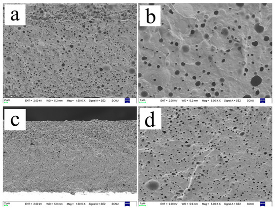 Comparison of the cross-sectional morphology of PBAT-based composite films of two thermoplastic starches. (a) 70PBAT/30TPHSg 1500×; (b) 70PBAT/30TPHSg 5000×; (c) 70PBAT/30TPHSg-4SiO2 1500×; (d) 70PBAT/30TPHSg-4SiO2 5000×.