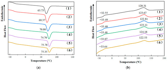Changes in the DSC curves of PBAT/TPHSg-4SiO2 composite films with the addition of TPHSg-4SiO2. (a) The first cooling process; (b) the second heating process. (1) Black: Pure PBAT; (2) Red: 90PBAT/10TPHSg-4SiO2; (3) Blue: 80PBAT/20TPHSg-4SiO2; (4) Green: 70PBAT/30TPHSg-4SiO2; (5) Purple: 60PBAT/40TPHSg-4SiO2; (6) Brown: 50PBAT/50TPHSg-4SiO2.