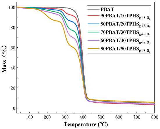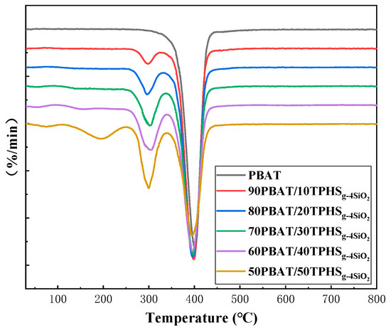 The decomposition onset temperature of pure TPHSg-4SiO2 was 275.4 °C. After compounding with PBAT, the decomposition temperature of the starch phase increased and gradually decreased as the TPHSg-4SiO2 content increased. The decomposition peak of the starch phase gradually increases with the increase of the TPHSg-4SiO2 content, as shown in Figure 8. The decomposition onset temperature of pure PBAT was 400.7 °C. The addition of TPHSg-4SiO2 to the mix decreased the onset decomposition temperature of PBAT and showed a decreasing trend with the increase of the TPHSg-4SiO2 content.