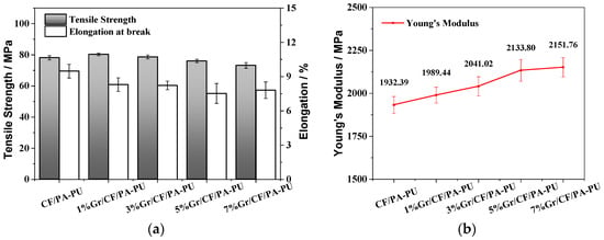(a) Tensile strength, elongation at break, and (b) Young’s modulus of CF/PA-PU composites with different contents of Gr.