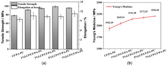 (a) Tensile strength, elongation at break, and (b) Young’s modulus of CF/PA-PU composites with different contents of LCP.