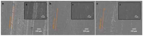 During the sliding process, the heat and external force caused by friction soften the polymer matrix. As depicted in Figure 4a,d, plucked and ploughed marks were found on the wear surface of the CF/PA-PU composite, indicating an adhesive and plough wear mechanism. Nevertheless, the carbon fibers exposed to the surface during the friction process act as a solid lubricant to mitigate this phenomenon. Incorporating Gr or LCP into CF/PA-PU composites enhanced their mechanical properties, enabling them to effectively resist the plastic deformation of the matrix, which could be inferred from the relatively smooth wear surfaces of the 3%Gr/CF/PA-PU and 5% LCP/CF/PA-PU composites in Figure 4.