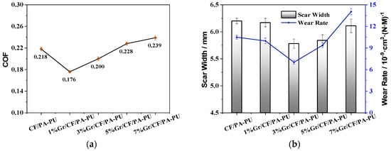 Figure 5a demonstrates that the introduction of 1 wt.% Gr into the CF/PA-PU composite results in a decrease of 19.27% in COF compared to the CF/PA-PU composite, which had a COF of 0.218. As shown in Figure 5b, the scar width and wear rate of 3%Gr/CF/PA-PU reach the lowest values of 5.78 mm and 7.02 × 10−9·cm3·(N·M)−1, which are 6.77% and 33.08% lower than those of the CF/PA-PU composite, respectively. Gr, as a solid lubricant, can be released from the matrix during the sliding process. Then, Gr was exposed and attached to the wear surface to form a graphite crystal transfer film, resulting in lower COF, scar width, and wear rate for the composites []. The aggregation and poor dispersion of the Gr can cause stress concentration and defects in the composite, such as microcracks and voids, which are observed in Figure 4e. The higher content of graphite has further exacerbated this phenomenon, making it easier to pull out the fillers from the matrix. As a result, there is an increase in COF, scar width, and wear rate.