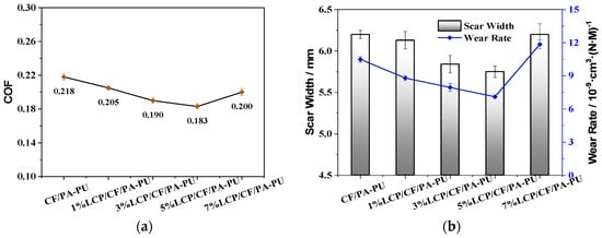 Figure 5a and Figure 6a illustrate the COF of CF/PA-PU composites with Gr and LCP, respectively. As the filler content increases, the COF, scar width, and wear rate of both the Gr/CF/PA-PU and the LCP/CF/PA-PU composites decrease first and then increase.